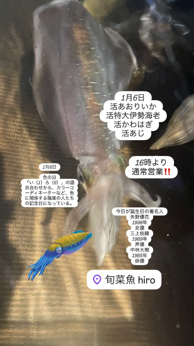 新鮮な活いかと魚、清瀬の野菜を